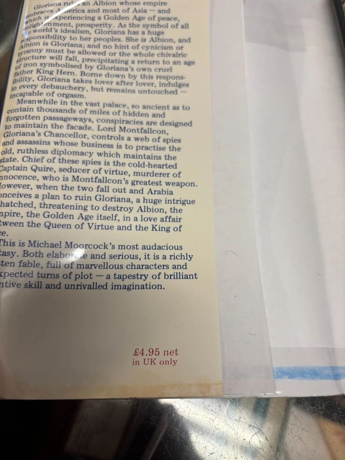 A fable satirizing Spenser's "The Fairie Queen" and reflecting the real life of Elizabeth I, tells of a woman who ascends to the throne upon the death of her debauched and corrupted father, King Hern. Gloriana's reign brings the Empire of Albion into a Golden Age, but her oppressive responsibilities choke her, prohibiting any form of sexual satisfaction, no matter what fetish she tries. Her problem is in fact symbolic of the hypocrisy of her entire court. While her life is meant to mirror that of her nation - an image of purity, virtue, enlightenment and prosperity - the truth is that her peaceful empire is kept secure by her wicked chancellor Monfallcon and his corrupt network of spies and murderers, the most sinister of whom is Captain Quire, who is commissioned to seduce Gloriana and thus bring down Albion and the entire empire.
