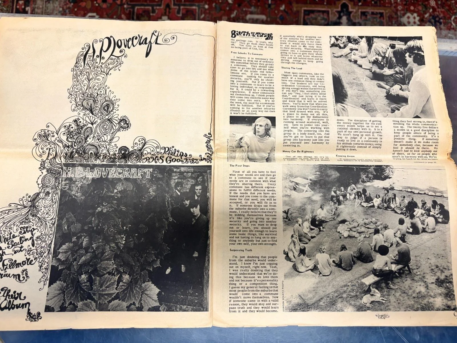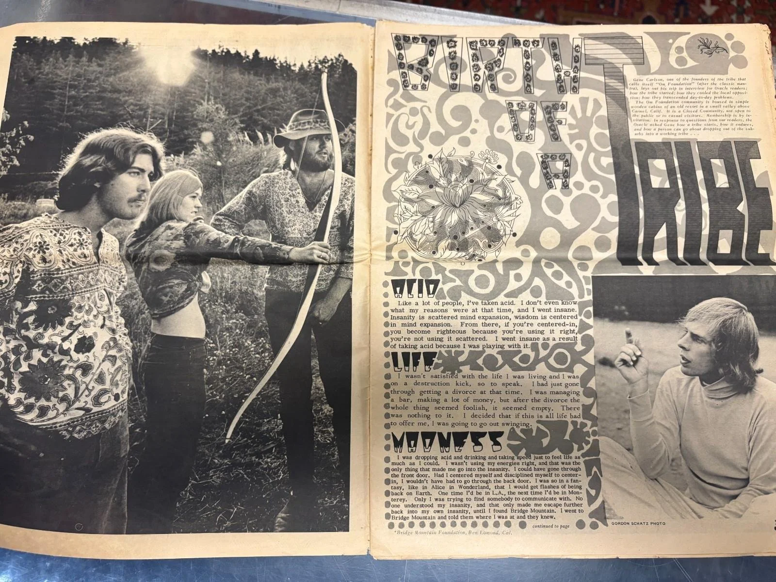 The covers of these three issues are themselves works of psychedelic art. Issue No. 7 (Nov. 1967) features a centaur archer rendered in swirling purples and lime greens, its hallucinogenic floral filigree weaving around the muscular hybrid form. Another cover shows a spectral, radiant goddess figure with piercing red eyes and an elaborate headdress—a visual invocation of the Divine Feminine, central to countercultural visions of pre-patriarchal harmony. The third issue, from October 1967, is awash with nude forest-dwelling figures, dancing freely in the woods—an Edenic hallucination of uninhibited communal life. Inside, richly inked spreads employ op art and kaleidoscopic symmetry, including a double-page mandala of distorted Beatles portraits accompanying “A Beatle Meets the Press,” a satirical meditation on media voyeurism and pop deification.Articles include “Birth of a Tribe,” an extended interview with group members of a rural hippie commune: “I don’t even know what my reasons were at that time, and I won’t invent any. It wasn’t a sensation–mind expansion, wisdom—it centered around acquaintances.” Another highlight is a prophetic centerfold by Timothy Leary titled “Tim Leary’s Prediction,” printed over a radiant orange-yellow gradient, where Leary proclaims Millbrook as “an advanced experimental station where people are working on the lifestyle of the future.” His language blends Eastern mysticism with early cybernetic futurism: “Psychedelic chemicals and psychedelic methods using electronics completely revolutionized man and his conception of himself.”